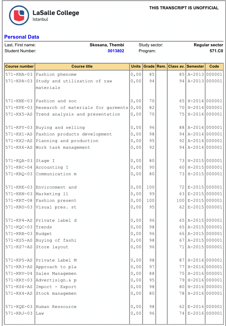 I qualified in Fashion Marketing with excellent results as seen below. Click the above to see transcript.